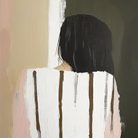 De penseelstreken zijn sober en krachtig, met een tastbare textuur die de zachtheid van de huid en de zwaarte van stilte voelbaar maakt. Het palet van aardse tinten — beige, wit, zachtroze en diep zwart — ademt rust, maar draagt ook een ondertoon van melancholie. In het contrast tussen licht en schaduw ontvouwt zich een subtiel spanningsveld: het verlangen naar verbinding tegenover de noodzaak van afzondering.