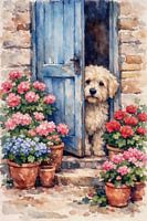 Achter een halfopen, verweerde blauwe deur verschijnt een kleine hond als stille bewaker van huiselijkheid en rust. Omringd door bloeiende potplanten en zachte stenen muren vangt het werk een moment van alledaagse poëzie: nieuwsgierigheid, trouw en een vleugje verlangen naar buiten. De aquarelachtige stijl en het lichte kleurpalet geven…