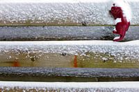 Een stenen beeld van een kat kijkt verbaasd naar wat er nu weer op de schutting is beland. Het is ook pas sinds 2014 dat er ineens zoveel sneeuw valt.