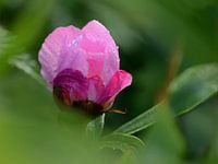 Deze pioen kwam zo fris en zonnig tussen het groen door kijken, dat ik hem wel móest fotograferen.