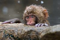 Een schattige jonge sneeuwaap rust even uit aan de rand van de warm water bron. De sneeuwapen zijn onderling behoorlijk competitief en daardoor ook erg actief en alert. Even uitrusten is soms dus wel even lekker en nodig ;)
