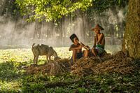 Javaanse jongens die zich vermaken met een fluit en zang onder een boom in de natuur. Hun geit zoekt naar vers gras.