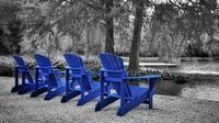 Foto omgezet naar zwartwit behalve de blauwe stoelen. Een zogenaamde colorsplash.