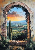 Evening Glow through Old Stones - Dit landschapsschilderij toont een sereen uitzicht op glooiende heuvels en slanke cipressen door een oud, boogvormig stenen venster, waarbij de zonsondergang de lucht in vurige tinten rood en oranje kleurt.