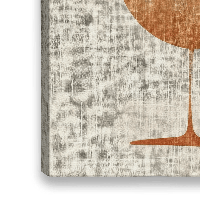Evening Pour Elegance - Dit wijn schilderij toont twee prominente wijnglazen op een eenvoudig achtergrond met een textuur die aan fijn canvas of linnen doet denken. Het linker glas is gevuld met een licht oranje wijn, vermoedelijk een rosé, terwijl het rechter glas een rijkere, diep bordeauxrode wijn bevat, wat doet denken aan een volle rode wijn. De glazen hebben beide een moderne, gestileerde vorm met brede, ronde kommen en slanke stelen, wat een gevoel van elegantie toevoegt aan de compositie. De kleurenovergang in beide glazen is subtiel en suggereert een zachte schittering van het licht op de vloeistof. Het gebruik van kleur en de abstracte stijl geven het kunstwerk een minimalistische maar expressieve uitstraling, geschikt voor moderne wijnliefhebbers.