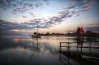 A long exposure transforms the surface of the Ijsselmeer into a mirror in which the slowly drifting clouds are reflected, lit by the last light of a setting sun.