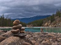Landschapsopname van de wilde Athabasca-rivier in Jasper National Park, Alberta, Canada in de Rocky Mountains met een rotsachtige oever en stenen spitsen op een bewolkte dag in de herfst.