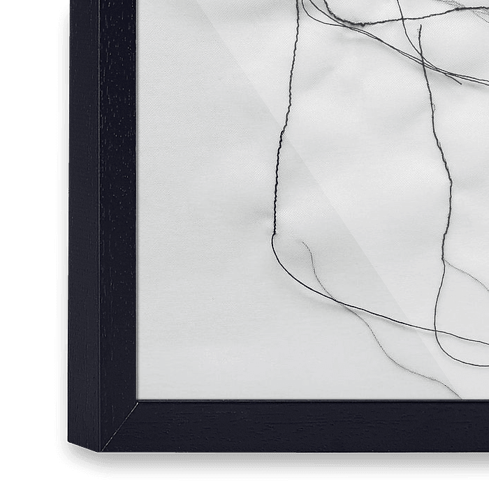 Een figuratief werk van zwart draad op wit transparant. Een innige omhelzing, de losse draden van het werk geven het beeld vrijheid & beweging.