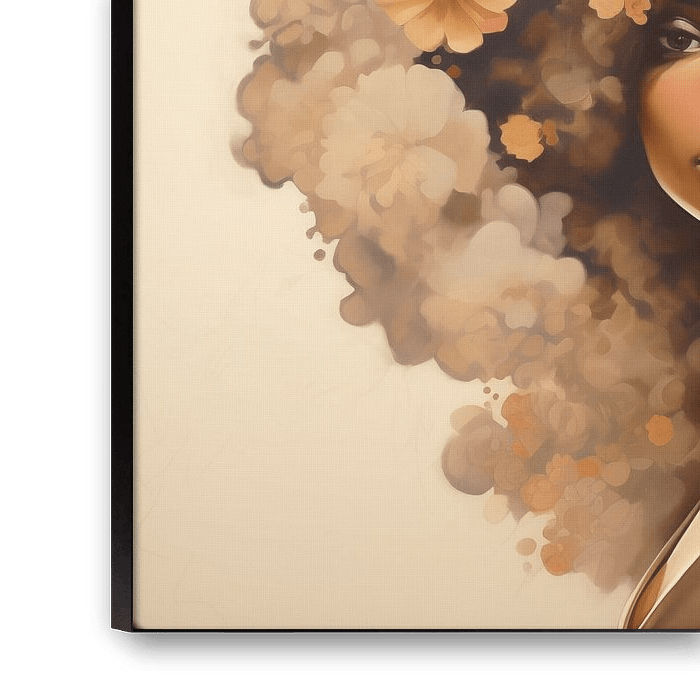 Een portret van een Afro-Amerikaanse vrouw met bloemen in haar kapsel. Beige en warme tinten.