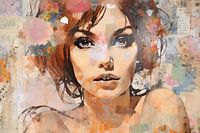 Evi Portret - abstract schilderij / mixed media kunst geschilderd. Mooi contrast tussen het verfijnde portret en rauwe collage/schildertechniek.
