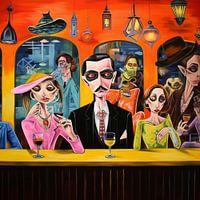 Een levendig schilderij in felle kleuren toont een groep excentriek geklede mensen aan een gele bar in een levendige scène. De figuren hebben overdreven gelaatstrekken en dragen opvallende kleding en accessoires. Op de achtergrond zijn andere eigenzinnige personages en ongewone voorwerpen te zien, zoals hoeden en lantaarns. De sfeer is dynamisch en licht griezelig, met een vleugje surrealisme. Het kleurenpalet is intens, met rood, geel en blauw die het bizarre en fascinerende landschap onderstrepen.