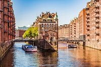 Excursieboten bij de waterburcht in de Speicherstadt in de haven van Hamburg, links op de achtergrond de Elbphilharmonie, het nieuwe herkenningspunt van Hamburg. Sinds 2015 maakt de Speicherstadt deel uit van het UNESCO Werelderfgoed, Hamburg, Duitsland.