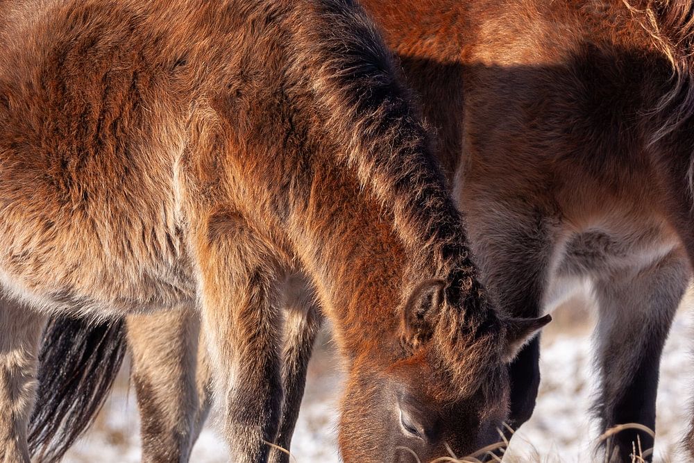 Grazende Exmoor pony's in sneeuwlandschap bij warm ochtendlicht. Gefotografeerd nabij Bergen aan Zee. Deze kleine paarden lopen vrij rond in de bossen en duinen van het Noord Hollandse duinreservaat.