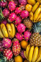 Een levendig samenspel van felle kleuren en exotische vormen ontvouwt zich in deze fruitige collectie. De stralende drakenvruchten met hun fuchsiakleurige buitenkant harmoniëren perfect met de goudkleurige bananen en stekelige ananassen. Deze artistieke compositie brengt frisse energie in elke keuken en inspireert tot culinaire creaties.