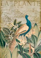 nostalgische kunstcollage met pauw in een exotische vegetatie en typografische elementen