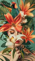 Vrouwelijk portret verweven met de exotische pracht van de natuur. De compositie is een harmonieuze samensmelting van flora en fauna, met opvallende oranje bloemen die het beeld domineren en de zachtheid van het vrouwengezicht accentueren. Een papegaai met levendige kleuren en een kleine vogel voegen een dynamische en levendige toets…