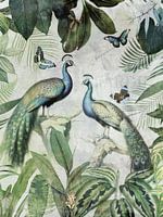 Fleur je kamer op met een luxueuze muurschildering van Uta Naumann met een klassieke junglescène. Twee elegante blauwe pauwen sieren het motief, omringd door torenhoge palmbomen, weelderig gebladerte en delicate witte exotische bloemen. De gedempte kleuren en lichtgrijze grunge-achtergrond creëren een rustig, verouderd effect dat doet denken aan historische schilderijen. Deze ingewikkelde collage combineert vintage charme met verfijnde details en biedt een kalme maar weelderige esthetiek. Perfect voor verfijnde interieurs, het vangt de exotische allure van de natuur met tijdloze elegantie en ingetogen luxe.