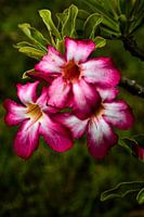 Deze foto benadrukt de opvallende schoonheid van een tropische bloem, waarschijnlijk een Adenium obesum, ook bekend als woestijnroos. De bloemblaadjes, in levendige tinten dieproze die vervagen naar zuiver wit in het midden, vormen een harmonieus contrast dat onmiddellijk in het oog springt. De zijdeachtige textuur van de bloemblaadjes en de bijna perfecte symmetrie van de bloem onthullen een natuurlijke balans van grote elegantie. Op de achtergrond steekt het zachte, donzige groen van het gebladerte subtiel af tegen de bloemen, waardoor een rustgevend, verfijnd visueel effect ontstaat. Deze plant, die vaak voor de sier wordt gekweekt, gedijt goed in warme, zonnige klimaten en symboliseert kracht, veerkracht en vergankelijke schoonheid. De gulle bloemen brengen een vleugje exotisme en kleur in elke buiten- of binnenruimte. De afbeelding vangt niet alleen de delicatesse van de bloem, maar ook haar levendige energie, die uitnodigt tot contemplatie en een reis naar verre landen waar de natuur hoogtij viert.
