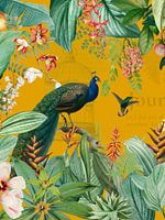 Deze vintage collage weerspiegelt de elegantie van de tropen met een prachtige compositie van weelderige tropische bladeren en levendig fruit. Twee prachtige pauwen staan centraal, hun iriserende veren glinsteren in blauwe, groene en gouden tinten. Het majestueuze verenkleed van de pauwen steekt af tegen het weelderige gebladerte en voegt een vleugje verfijnde schoonheid toe. De subtiele vintage texturen van de achtergrond versterken de algehele elegantie, terwijl de levendige kleuren van de bladeren en het fruit de scène tot leven brengen en een tijdloos, exotisch paradijs oproepen.