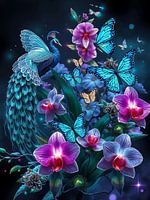 Een levendige en gedetailleerde illustratie van een pauw omringd door kleurrijke vlinders en exotische, bloeiende bloemen in een weelderige omgeving.