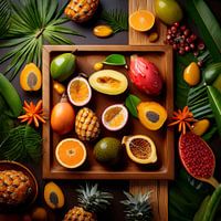 Een schaal exotisch fruit op een bamboemat, omringd door grote bladeren van tropische planten. Deze compositie is rijk aan kleur en gevarieerde vormen en weerspiegelt de weelderigheid en overvloed van deze verscheidenheid aan smaken, met avocado, kiwi, soursop, mango, ananas, papaja en meer. De ronde, vlezige ovale vormen van het fruit,…
