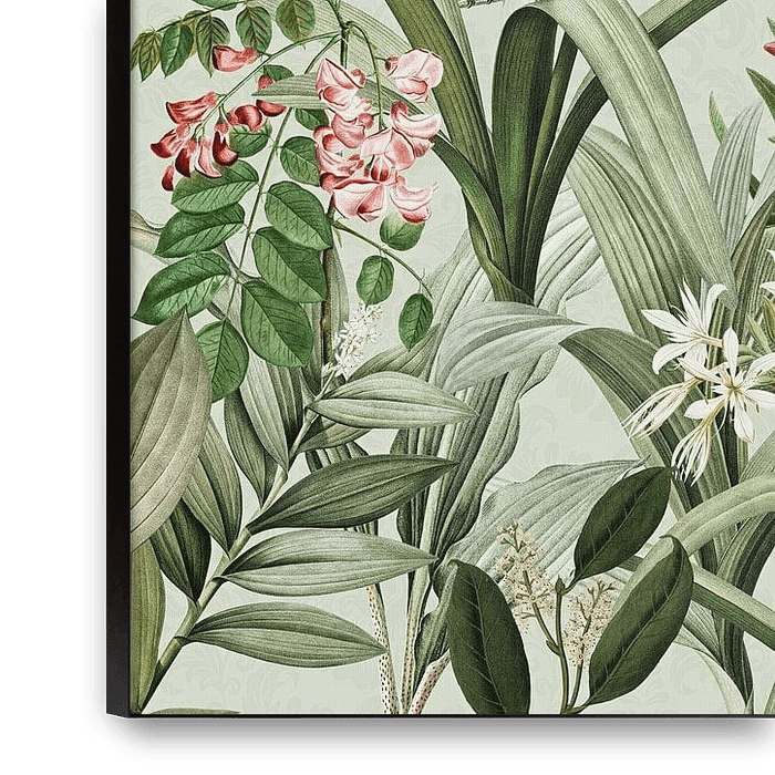 Stel je een luxueus vintage schilderij voor in landschapsformaat dat de kijker meeneemt naar een tropische jungle met weelderige palmbladeren, tropische bloemen, levendig gebladerte en exotische toekan- en kolibrievogels te midden van het groene landschap. De scène, in een sepia-zilverkleurenschema, straalt tijdloze elegantie en…