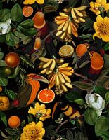 Vintage patroon van antieke handgeschilderde elementen zoals tropische bloemen, camelia's, exotische vruchten en prachtige toekans op een zwarte achtergrond met een sepiabruine tint.