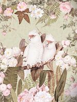 Een luxe vintage ontwerp van Uta Naumann met een appelgroene achtergrond die een frisse, levendige basis vormt voor de scène. Twee prachtige witte en roze kaketoes troont in het midden, omringd door weelderige redouté rozen in delicate roze tinten. De compositie combineert de charme van antieke botanische illustraties met tropische…