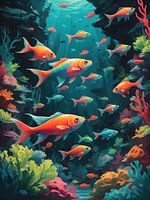 Dit kunstwerk vangt de levendige onderwaterwereld vol kleurrijke vissen en weelderige koraalriffen. Geïnspireerd door stijlen als surrealisme en popart, worden de felle kleuren en gedurfde lijnen gecombineerd met een gedetailleerde weergave van het zeeleven. De visuele elementen doen denken aan de werken van David Hockney en Henri Matisse, waarbij het gebruik van intense kleuren en vloeiende vormen opvalt.