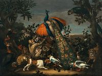 Exotische vogels, een pauw met een aap en honden in een landschap, Antoine Monnoyer