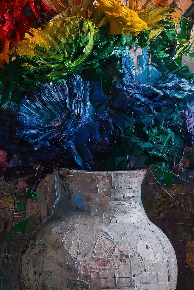 Dit levendige kunstwerk brengt een explosie van kleur in elke ruimte. De heldere en krachtige penseelstreken vormen een boeiend schouwspel van licht en schaduw, waarbij de illusie van een vaas gevuld met bloemen tot leven komt. Elk detail lijkt te dansen in een harmonieus ritme van kleuren, van dieprood tot zonnig geel, oceaanblauw en frisgroen. Dit stuk is niet alleen een visuele traktatie maar belichaamt ook dynamiek en passie, perfect voor de kunstliefhebber die een statement wil maken. Of het nu in de woonkamer, kantoor of een andere favoriete ruimte is, dit ontwerp brengt energie en inspiratie.