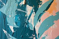 Het toont een dynamische collage van acrylverf in gedurfde slagen van mintgroen en subtiele hints van zalmroze, gescheiden door strepen van onbewerkt canvas. De dikke lagen verf liggen op sommige plaatsen opgestapeld, terwijl in andere delen de onderliggende lagen zichtbaar zijn, wat zorgt voor een diep en complex oppervlak. Spatten en druipers van verf doorbreken de grenzen en voegen een element van onvoorspelbaarheid toe. Het kunstwerk nodigt de kijker uit om dieper te kijken en de emotionele impact van kleur en vorm te ervaren.