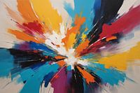 "Explosie van Kleurendynamiek" vangt de essentie van beweging en emotie door het gebruik van felle, contrasterende kleuren en dynamische spattechniek. Het canvas komt bijna tot leven met de abstracte representatie van een explosie, waarbij elke kleur lijkt te strijden voor aandacht. De techniek van de kunstenaar toont een meesterlijk gebruik van olieverf, die de textuur en het contrast versterkt. Het kunstwerk spreekt tot de verbeelding en nodigt de kijker uit om een eigen interpretatie te geven aan de chaos van kleuren. De interactie tussen de tinten blauw, rood, oranje en geel creëert een vibrerende energie die van het doek afspat. De zwarte en witte accenten voegen diepte en complexiteit toe aan het stuk, waardoor de abstracte compositie een emotionele lading krijgt. Dit schilderij is een toonbeeld van moderne kunst die de kijker uitdaagt en prikkelt.