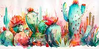 Dit levendige, trendy kunstwerk is een kleurrijke en dynamische aquarel die een verscheidenheid aan cactussen en hun bloeiende bloemen uitbeeldt.