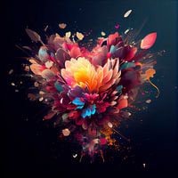 Het digitale kunstwerk 'Explosie van Liefde' is een visueel overweldigende ervaring die de kracht van bloemen in een hartvormige explosie weergeeft.