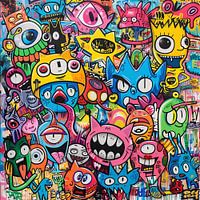 Deze afbeelding is een eerbetoon aan stedelijke graffitikunst en barst van de levendigheid. Met een overvloed aan stripachtige figuren, kleurrijke patronen en expressieve gezichten vult de afbeelding het hele oppervlak met energie en creativiteit. Het kleurenpalet varieert van felroze tot felgeel en diepblauw, wat een spannende visuele…