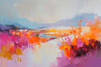 Er ontvouwt zich een kleurrijk schouwspel van levendige paarse en oranje tinten, dat doet denken aan de bloei van wilde bloemen in een zacht landschap. De kleuren vermengen zich harmonieus met een vleugje licht en creëren een vredige sfeer. Ideaal voor de woonkamer, waar het energie en een positieve stemming verspreidt.