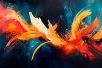 Heldere rode en oranje kleuren dansen dynamisch over een diepblauwe achtergrond, alsof ze rechtstreeks uit een creatieve explosie komen. Deze krachtige compositie straalt energie en passie uit, perfect om een gespreksonderwerp te creëren in een moderne woonkamer of als inspirerend element op kantoor.