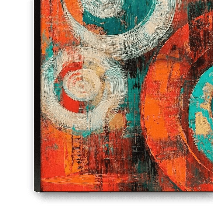 Dynamische spiralen dansen over het oppervlak in levendige tinten turquoise en oranje. Deze spannende compositie brengt beweging en energie in elke kamer. Ideaal voor een creatieve woonkamer of een inspirerend kantoor, waar het kleurenspel de verbeelding prikkelt en een uitnodigende sfeer creëert.