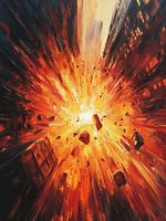 Dit werk toont een krachtige explosie van kleur, gedomineerd door fel oranje en geel. De kleurspatten en stralende lijnen lijken uit het midden van het schilderij te barsten en creëren een krachtige en energieke sfeer. Dit kunstwerk straalt dynamiek en beweging uit en is ideaal voor creatieve of expressieve omgevingen.