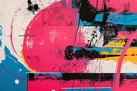 Het canvas is een slagveld van roze, blauw en geel, doorsneden door assertieve zwarte lijnen en bespat met witte en donkere verfspetters die zorgen voor een sterke visuele impact. De penseelstreken zijn zowel gericht als wild, wat zorgt voor een gestructureerde chaos die de kijker uitdaagt om de orde binnen de wanorde te vinden. Het stuk lijkt te pulseren met een stedelijke energie, reminiscent aan graffiti en straatkunst, waardoor het een eigentijdse en rebelse sfeer krijgt. Het werk communiceert een gevoel van beweging en spontaniteit, en weerspiegelt de snelle veranderingen en de puls van het moderne leven.