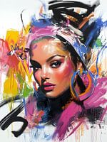 Kleurrijk mixed media portret van een vrouw met verf en illustratie elementen in streetart stijl.