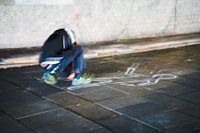 Een kunstenaar met krijt op straat. Onder een brug met krijt en een bijzonder idee. Crime scene tekeningen door de stad heen op de stoep straat en parkeergarages. Een bijzonder persoon.