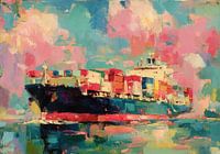 Dit schilderij toont een groot vrachtschip in een levendige, impressionistische stijl. Met krachtige penseelstreken en intense kleuren als blauw, groen, rood, geel en roze oogt het schip dynamisch en vol beweging. De donkerblauwe romp met een rode rand, de kleurrijk gestapelde containers en het diagonaal geplaatste schip creëren een…