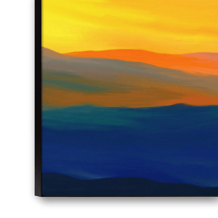 Een mooi cadeau voor liefhebbers van landschapsschilderijen, de bergen en natuurlijk de kleuren blauw, geel en oranje.