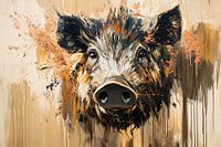 Dit opvallende kunstwerk toont een gedetailleerd portret van een wildzwijn, krachtig en levendig vastgelegd op doek. De expressieve penseelstreken geven het dier een bijna tastbare energie, terwijl de verf als het ware van het canvas af spat. Met rijke aardetinten zoals bruin, zwart en oranje, brengt het schilderij de ruwe, wilde natuur naar binnen. De abstracte achtergrond versterkt de dynamiek van het geheel, waardoor het werk niet alleen een natuurlijke uitstraling heeft, maar ook modern oogt. Ideaal voor liefhebbers van dieren en natuur, maar ook voor interieurs die een krachtige, visuele eyecatcher zoeken.