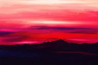 Expressief schilderij van een minimalistische berglandschap met een dramatische hemel in schitterende kleuren.
