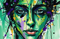 Een intens vrouwelijk portret in koele groentinten wordt doorbroken door dynamische verfspatten in paars en geel. Heldere penseelstreken tekenen de jukbeenderen, terwijl dunne druppellijnen langs de wangen lopen en spanning opbouwen. De ogen zijn scherp en gefocust, omkaderd door donkere contouren die een krachtig contrast vormen met de…