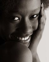 Zwart-wit close-up portret van een jonge vrouw met expressieve ogen en een stralende glimlach. Haar gezicht rust zachtjes in haar hand, wat warmte, vreugde en zelfvertrouwen uitstraalt. De intieme kadrering benadrukt de textuur van haar huid, de schittering in haar ogen en de natuurlijke glimlach, wat een krachtige emotionele connectie creëert. De monochrome tinten versterken het contrast tussen licht en schaduw, waardoor haar gelaatstrekken worden geaccentueerd en diepte aan het beeld wordt toegevoegd.