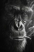 Sterke monochrome afbeelding van een aap met een sigaret, met menselijke trekken.